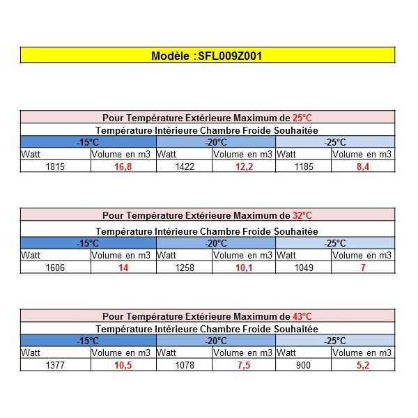 Voir dans le tableau de sélection le rapport température et volume en fonction de la température extérieure maximale et la température interne souhaitée dans votre chambre froide.