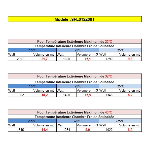 Voir dans le tableau de sélection le rapport température et volume en fonction de la température extérieure maximale et la température interne souhaitée dans votre chambre froide.
