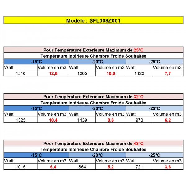Voir dans le tableau de sélection le rapport température et volume en fonction de la température extérieure maximale et la température interne souhaitée dans votre chambre froide.