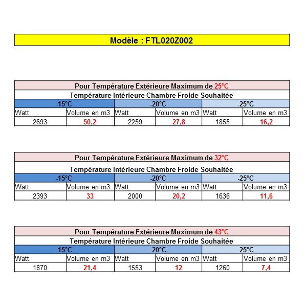 Voir dans le tableau de sélection le rapport température et volume en fonction de la température extérieure maximale et la température interne souhaitée dans votre chambre froide.